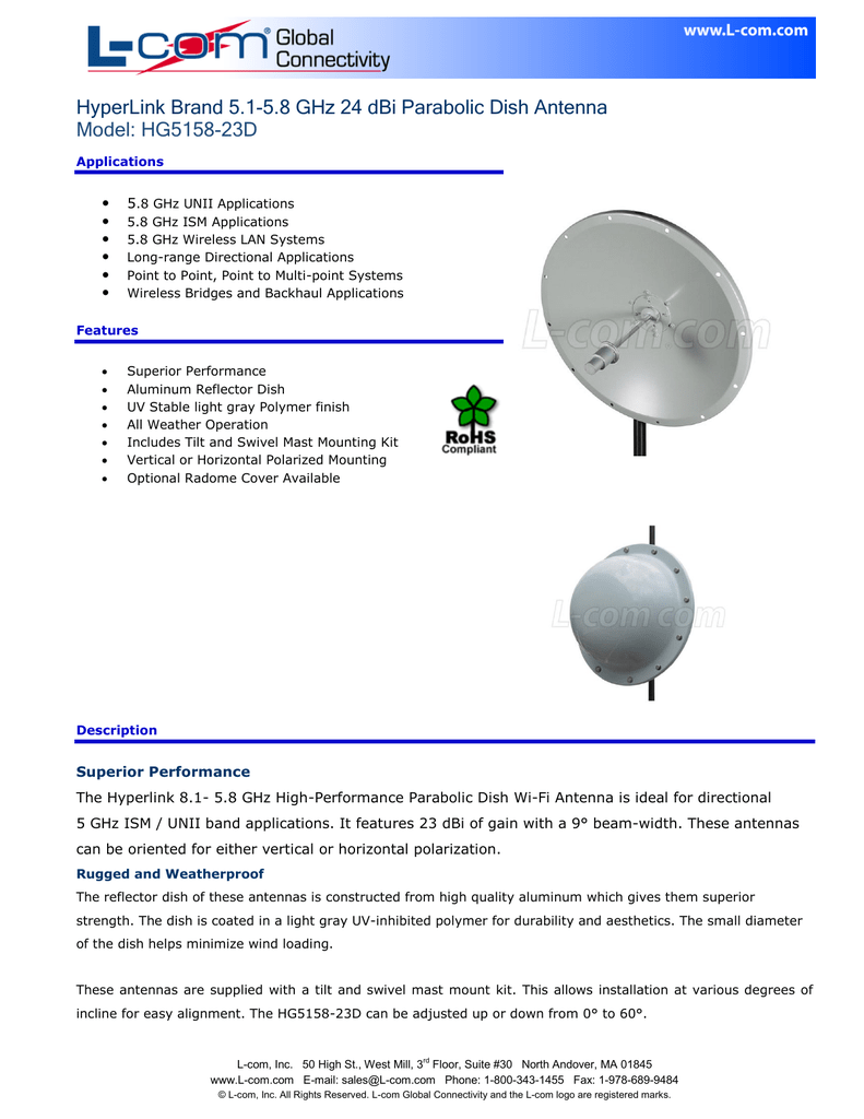 HyperLink Brand 5.1-5.8 GHz 24 dBi Parabolic Dish Antenna Model: HG5158-23D | Manualzz